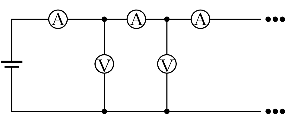 793. Do źródła o sile elektromotorycznej \(U=1{,}5\) V i zaniedbywalnym oporze wewnętrznym dołączono długi łańcuch jednakowych amperomierzy i taką samą liczbę jednakowych woltomierzy (rys. 1). Opór wewnętrzny amperomierza wynosi \(r=1\ \Omega,\) woltomierza 10 k\(\Omega.\) Jakie są wskazania pierwszego i drugiego amperomierza? Ile wynosi suma wskazań wszystkich amperomierzy oraz suma wskazań wszystkich woltomierzy w łańcuchu?