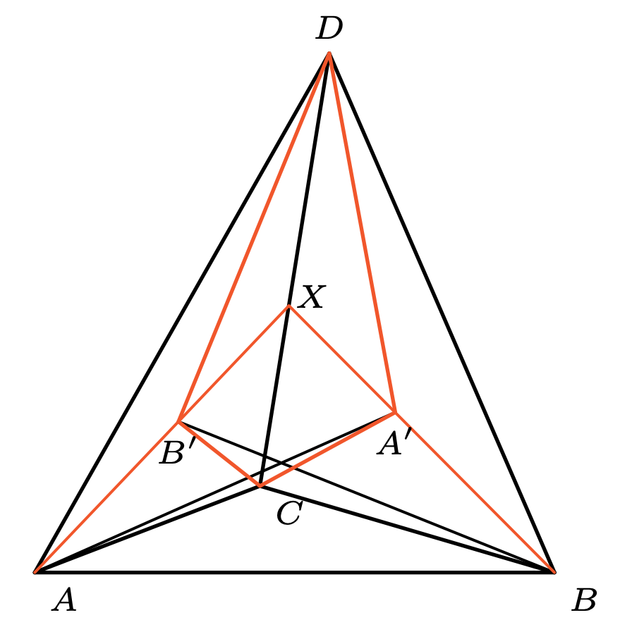 W czworościanie \(ABCD\) na ścianach \(BCD\) i \(ACD\) znajdują się, odpowiednio, punkty \(A'\) oraz \(B'\) takie, że \[\measuredangle AB'C = \measuredangle AB'D = \measuredangle BA'C = \measuredangle BA'D = 120^{\circ}.\] Wiadomo, że proste \(AA'\) i \(BB'\) przecinają się. Udowodnić, że odległości punktów \(A'\) oraz \(B'\) od prostej \(CD\) są równe.
