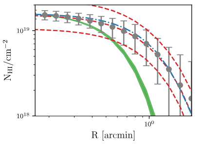 Aby to ustalić, musimy porównać kolumnowy rozkład gęstości masy, który obserwujemy (rys. 2), z teoretycznym rozkładem, jaki dawałaby ciemna materia i wodór. Musimy niestety założyć, że poza tymi dwoma składnikami w obłoku nie ma niczego innego (co nie musi być prawdą). Oczywiście nie w pełni rozumiemy, czym jest ciemna materia, wiemy jednak, że oddziałuje grawitacyjnie ze zwykłą materią, i potrafimy przewidzieć, jak te dwa składniki wpłynęłyby na kształt i rozkład gęstości w obłoku.