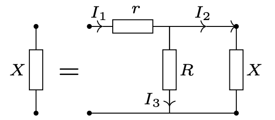 b) Część obwodu bez pierwszego amperomierza ma opór \(X - r = 99{,}5\ \Omega\). Natężenie prądu płynącego przez drugi amperomierz \(I_{2} = U_{2}/X\), gdzie \(U_{2} = U - rI_{1} = U( 1 - r/X ) = 0{,}99U\), \(I_{2} = 0{,}99I_{1} = 14,8\ \rm mA\).