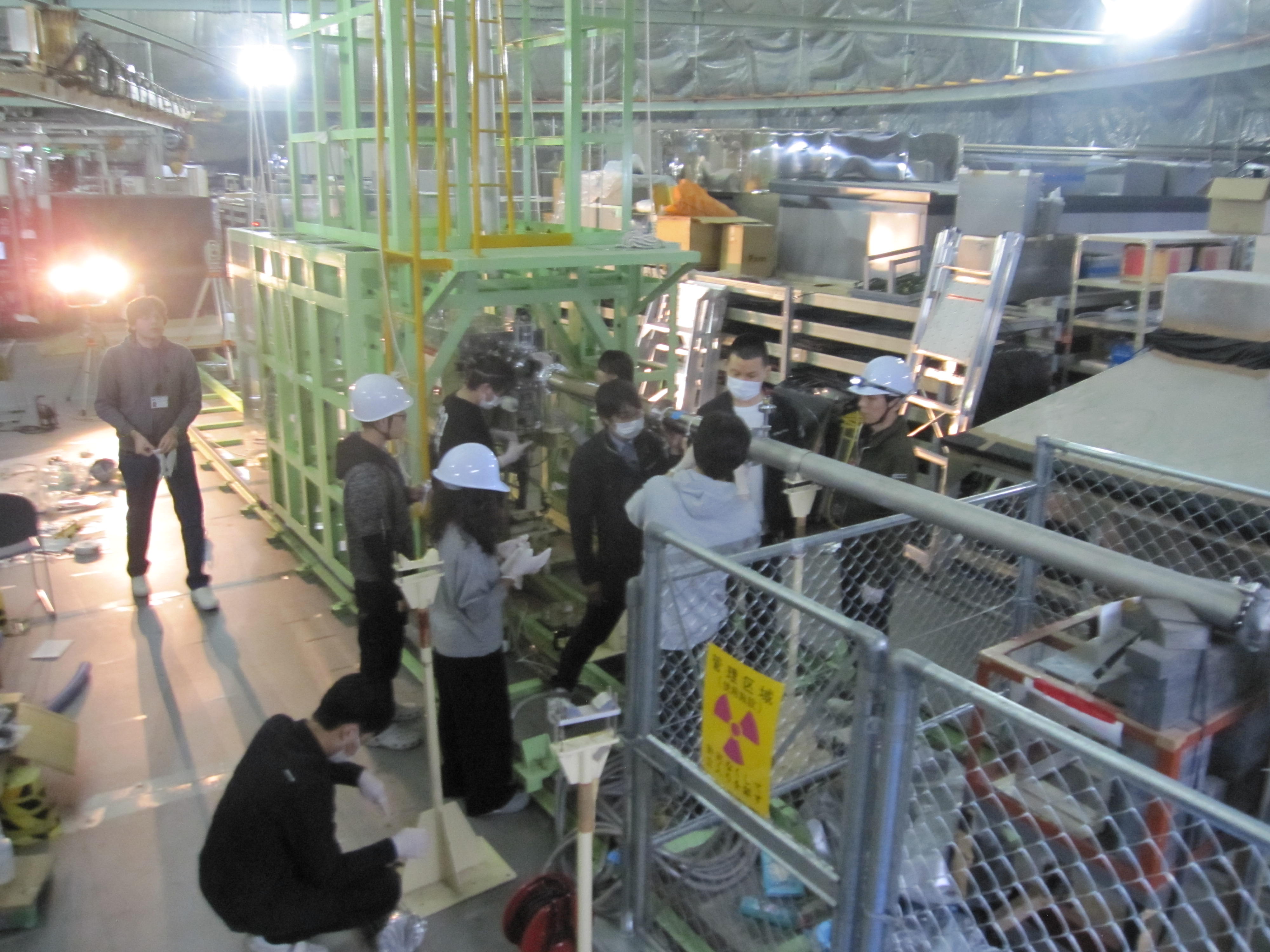 Zdjęcie z przygotowań do zbierania danych kalibracyjnych. Akcelerator znajduje się w bunkrze po prawej stronie. Na zdjęciu widać szarą rurę, którą przemieszczają się elektrony. Zbiornik z wodą jest poniżej – naukowcy stoją na górnej pokrywie detektora Super-Kamiokande. Widoczna na zdjęciu zielona konstrukcja służy do przechowywania i wprowadzania pionowych rur do zbiornika