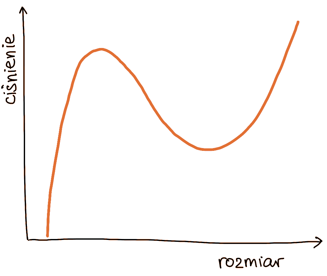 Wróćmy teraz do ciśnienia wewnątrz balonu i spróbujmy wyznaczyć jego charakterystykę w pełnym zakresie nadmuchania balonu. Widać bowiem, że fakt, iż ciśnienie wewnątrz jest odwrotnie proporcjonalne do promienia, nie może być uznany jako uniwersalny dla balonów. W rzeczywistości zależność ciśnienia od rozmiaru w balonie przypomina krzywą w kształcie litery N (patrz wykres rozmiar–ciesnienie po lewej stronie). Stopień krzywizny z kolei zależy od rodzaju gumy. W przypadku naszych balonów możliwa jest sytuacja, w której oba balony, choć różnych rozmiarów, będą napompowane w taki sposób, że ciśnienia wewnątrz będą takie same, i wtedy nic się nie stanie. Da się również tak dobrać poziom napompowania, że duży balon będzie tuż przed granicą pęknięcia i ciśnienie na tyle duże, że nadmucha on mniejszy balon.