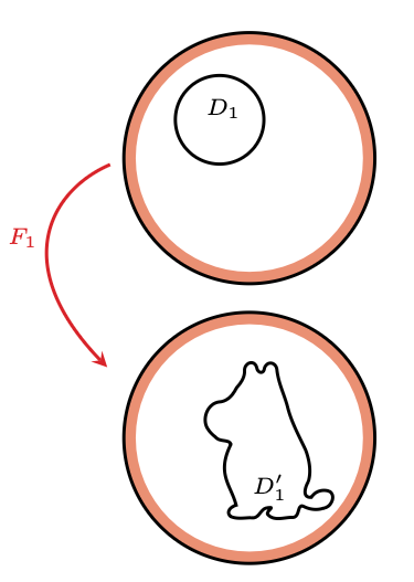 Dyfeomorfizm \(F_1\) przekształca \(D_1\) na \(D_1'\); szukamy jego przedłużenia, które jest identycznością na zaznaczonym na kolorowo obszarze