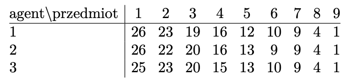 Zauważmy, że \(u_1(V) = u_2(V) = u_3(V) = 120.\) Rozważmy następujące trzy podziały zbioru \(V\) na trzy podzbiory: \[\begin{aligned} \mathcal{P}_1 = & (\{1,6,8\},\{2,4,9\},\{3,5,7\}), \\ \mathcal{P}_2 = & (\{1,5,9\},\{2,6,7\},\{3,4,8\}), \\ \mathcal{P}_3 = & (\{1,4\},\{2,5,8\},\{3,6,7,9\}). \end{aligned}\] Pomocna przy ich analizie może być tabelka, gdzie w wierszu odpowiadającym podziałowi \(\mathcal{P}_i\) przedstawione są wagi przedmiotów dla \(i\)-tego agenta.