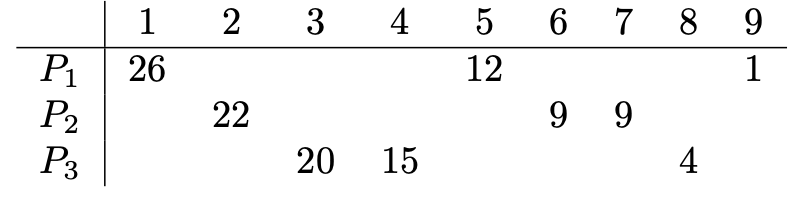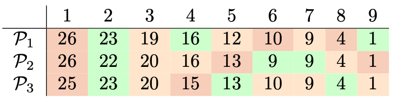 Powyższa konstrukcja pokazuje, że nie w każdej sytuacji mms-sprawiedliwy podział istnieje. Rozważmy jednak podział \(\mathcal{P} = (P_1,P_2,P_3),\) w którym \[P_1 = \{1,5,9\}, \ \ \ P_2 = \{2,6,7\}, \ \ \ P_3 = \{3,4,8\}.\] Pomocna może okazać się poniższa tabelka (w \(i\)-tym wierszu pokazane są odpowiednie wartości funkcji \(u_i\)).