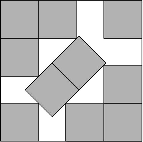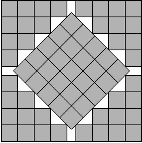 Oczywiste jest, że w kwadracie o wymiarach \(n \times n\) możemy tak ułożyć \(n^2\) kwadratów o boku 1, by ich wnętrza były parami rozłączne – nazwijmy takie umieszczenie małych kwadratów ,,dobrym”. Czy w sytuacji, gdy nieznacznie (o mniej niż 1) zwiększymy bok dużego kwadratu, można weń w dobry sposób włożyć więcej kwadratów jednostkowych? Nie da się tego zrobić, gdy będziemy je układać ,,standardowo”, czyli tak, by ich boki były równoległe do boków dużego kwadratu. Można je jednak umieścić inaczej… Na rysunkach poniżej pokazane są schematy takiego ułożenia. W kwadracie o boku \(3 + \frac{\sqrt{2}}{2}\) (w przybliżeniu \(3{,}71\)) zmieścimy \(3^2 + 1\) kwadratów jednostkowych (rys. 1). W kwadrat o boku \(5 + \frac{5\sqrt{2}}{2}\) (w przybliżeniu \(8{,}54\)) można włożyć \(8^2 + 1\) kwadratów jednostkowych (rys. 2). W tej sytuacji niepokryte pole w kwadracie wynosi \(\frac{50\sqrt{2}-55}{2}\), czyli w przybliżeniu \(7{,}86\).