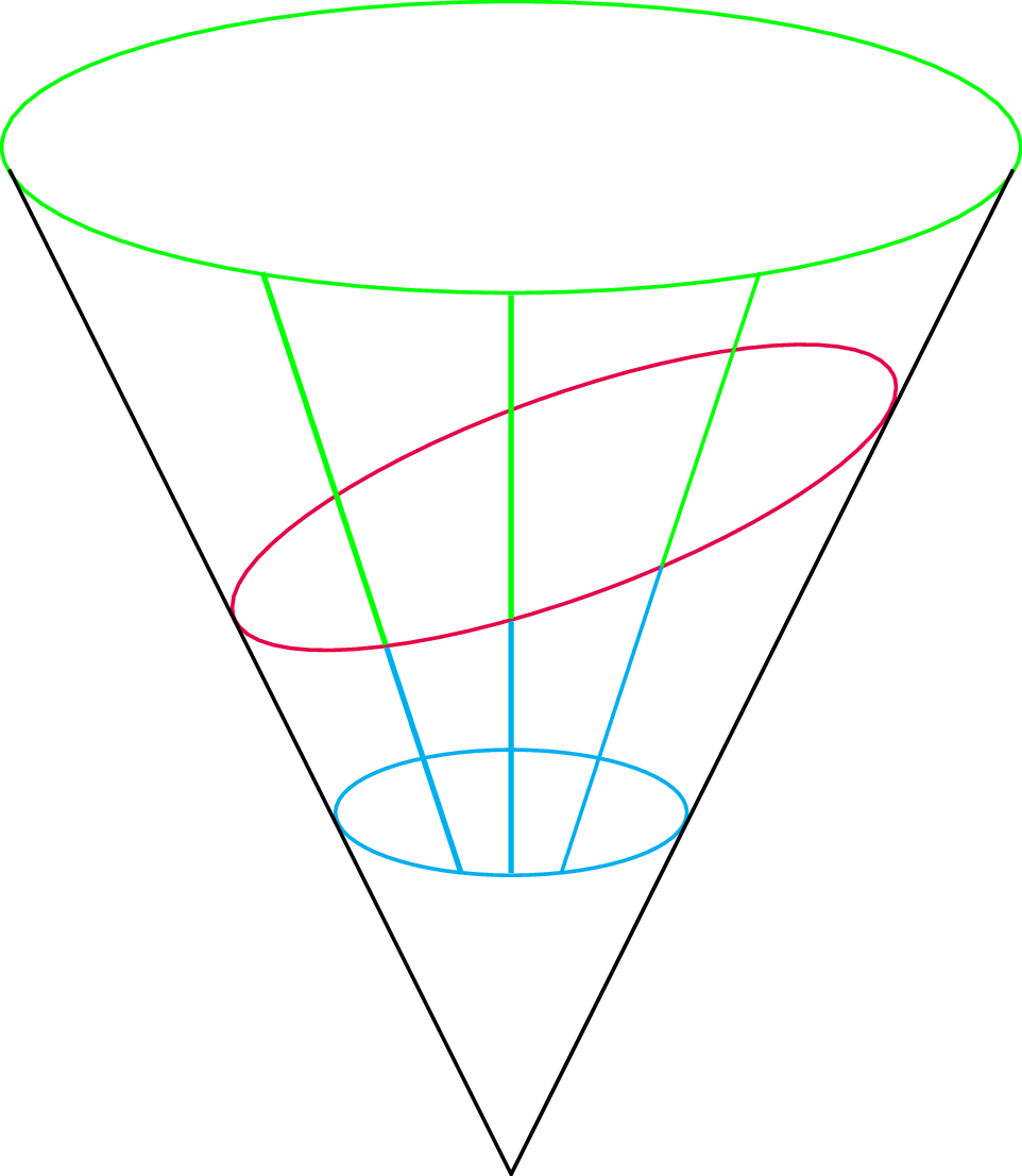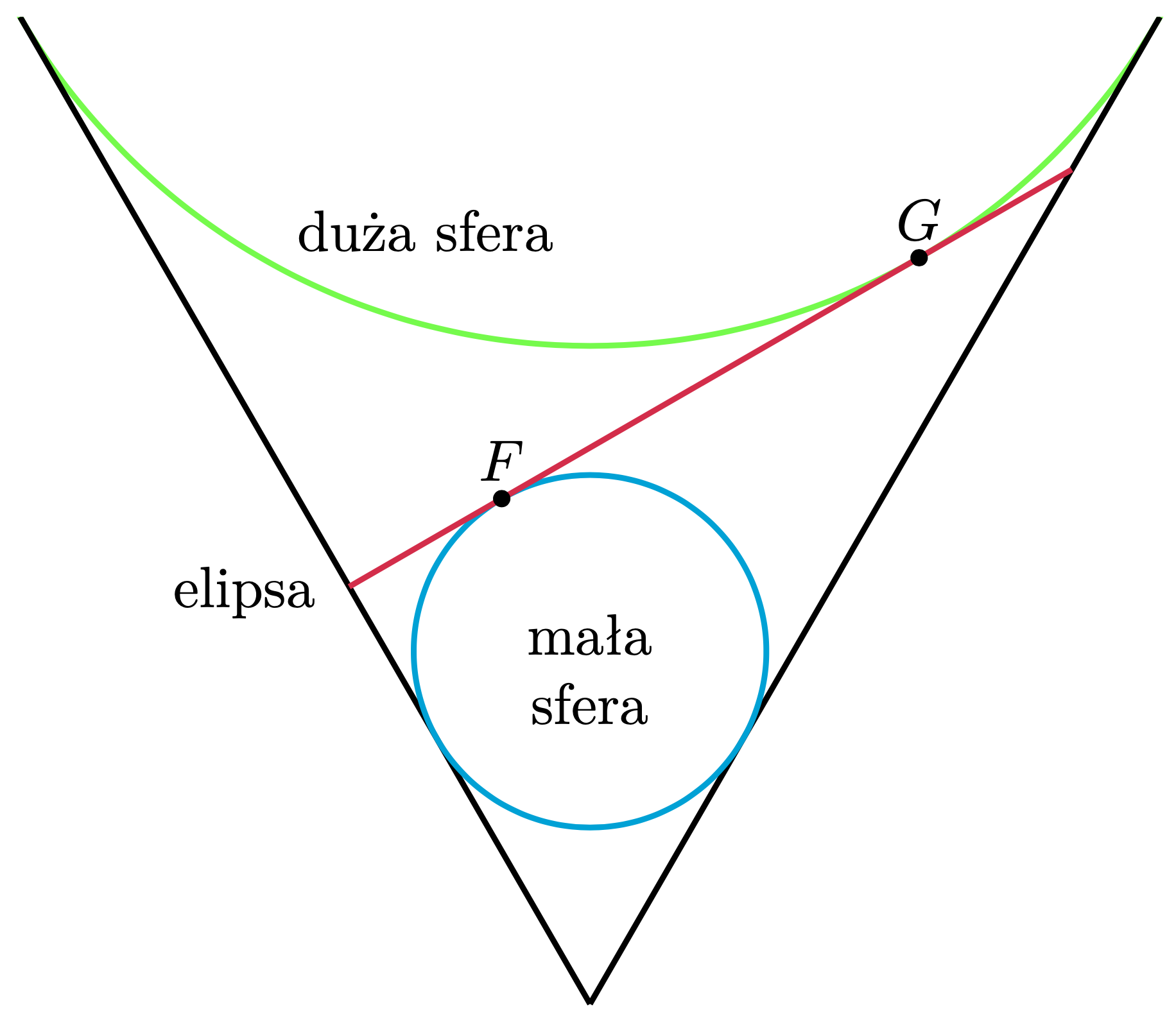 Żeby zorientować się, jakie równanie ma owalna krzywa powstająca z odpowiedniego przecięcia stożka płaszczyzną, wyobraźmy sobie dwie sfery, z których każda jest jednocześnie styczna do stożka i do płaszczyzny tnącej. W przekroju zawierającym oś symetrii stożka wyglądać to będzie jak na rysunku 1.