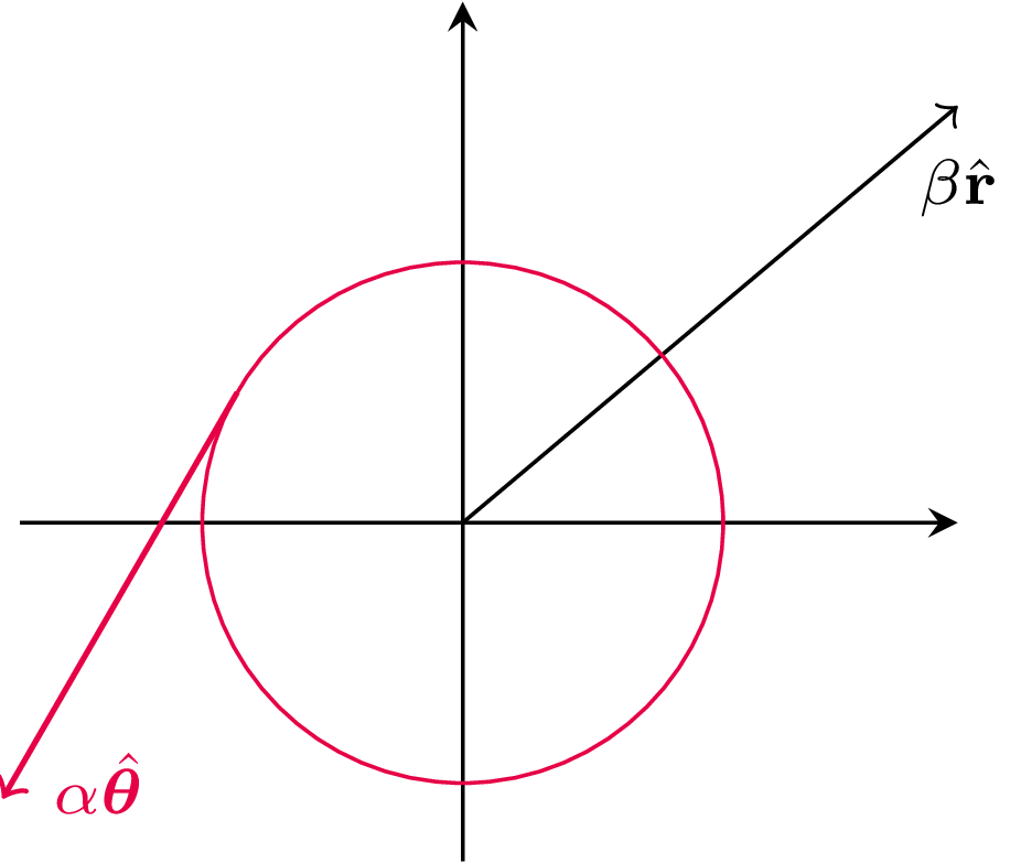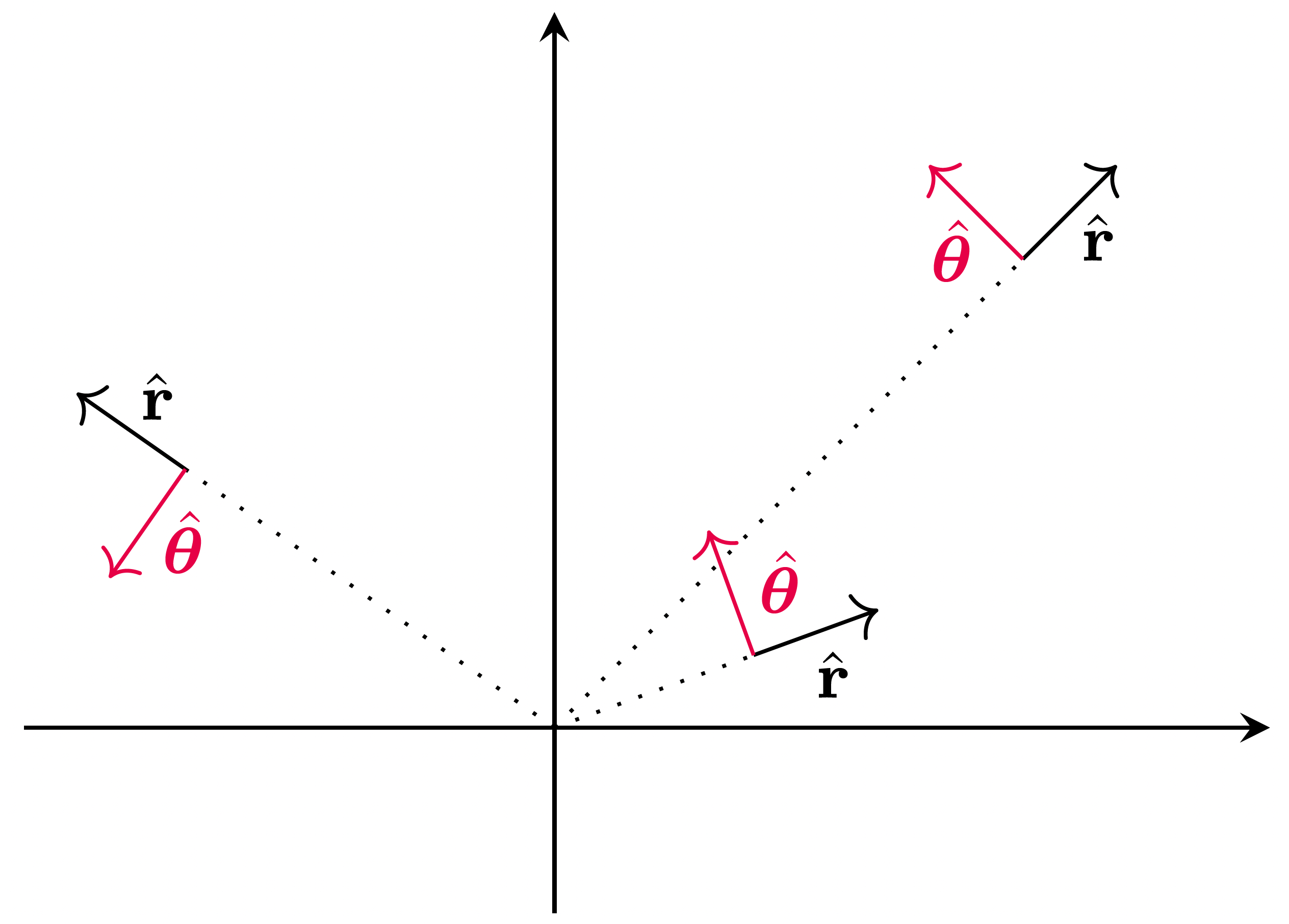 Ponieważ rozważać będziemy sytuację w biegunowym układzie współrzędnych, przypomnijmy, jak najwygodniej opisywać prędkość w tym układzie. W tym celu zdefiniujmy w każdym punkcie płaszczyzny wektory \(\hat{\bf r}\) oraz \(\skew3\hat{\pmb{\theta}}\). Wektor \(\hat{\bf r}\) w punkcie \((x,y)\) ma ten sam zwrot co wektor o współrzędnych \((x,y)\), ale długość zawsze równą jeden. Wektor \(\hat{\pmb \theta}\) to wektor jednostkowy prostopadły do \(\hat{\bf r}\), co obrazuje rysunek 6. Rozważmy teraz dwa specjalne przypadki ruchu (rys. 7):