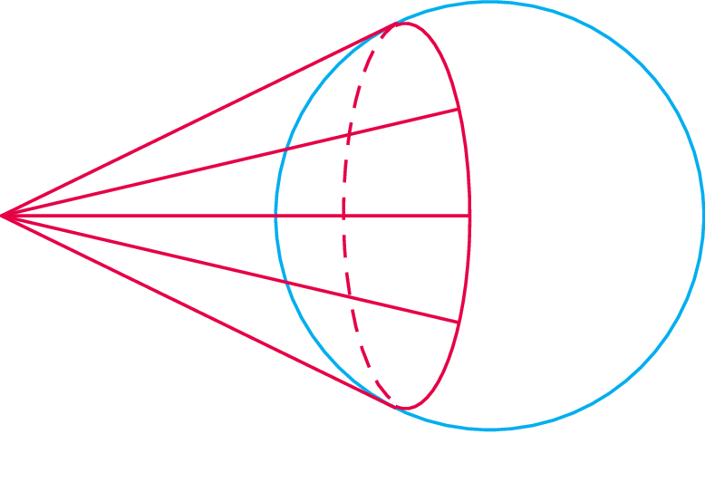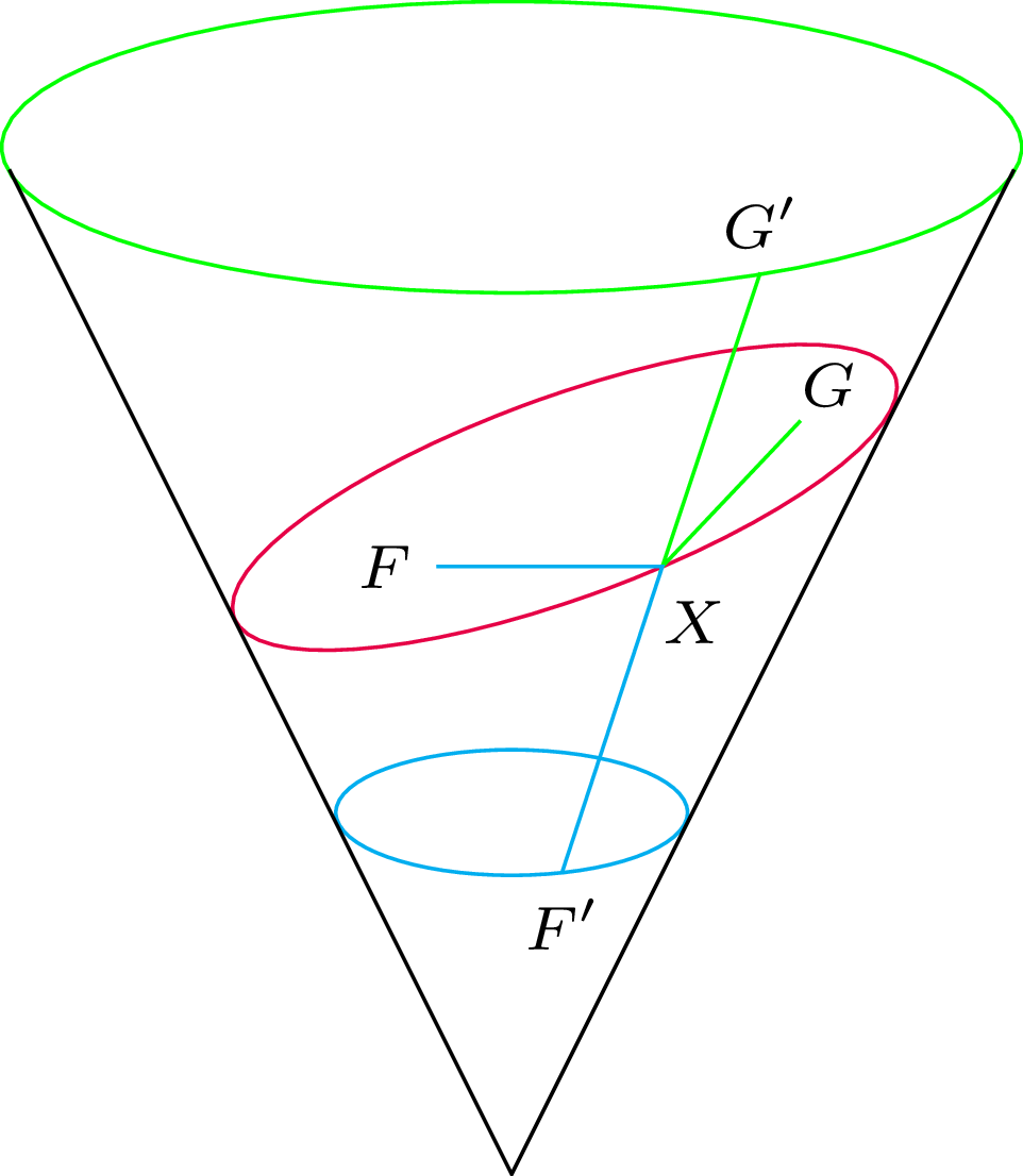 Oznaczmy przez \(F\) i \(G\) punkty styczności sfer z płaszczyzną (punkty te nazywać będziemy ogniskami elipsy). Zauważmy też, że punkty styczności sfer ze stożkiem tworzą dwa okręgi na powierzchni stożka. Niech odległość między tymi okręgami będzie równa \(2a\). Niech też \(F'G'\) będzie jakimkolwiek odcinkiem długości \(2a\) łączącym oba okręgi styczności. Oznaczmy przez \(X\) punkt na odcinku \(F'G'\), który należy do elipsy. Korzystając z tego, że dwa odcinki o tym samym początku styczne do tej samej sfery muszą być równej długości (rys. 2), mamy \(|FX|=|F'X|\) oraz \(|G'X|=|GX|\) (rys. 3), czyli \[|FX|+|GX|=|F'X|+|G'X|=2a.\] A zatem krzywa, którą otrzymaliśmy z przecięcia stożka, jest złożona z punktów, których suma odległości od punktów \(F\) i \(G\) jest stale równa \(2a\) (rys. 4). Jest to jedna z możliwych definicji elipsy (punkty \(F\) i \(G\) nazywamy wówczas jej ogniskami).