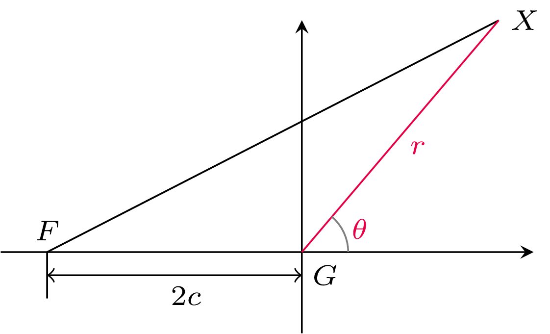 Oznaczając teraz odległość ognisk \(F\) i \(G\) przez \(2c\) i korzystając z twierdzenia cosinusów w trójkącie \(FGX\), mamy \[(2a-r)^2 = (2c)^2 + r^2 - 4cr \cos(180^{\circ}-\theta).\] Po standardowych przekształceniach dostajemy: \[r = \frac{\alpha}{1+\varepsilon \cos \theta},\] gdzie \(\alpha = \frac{a^2-c^2}{a}\), \(\varepsilon = \frac{c}{a}\).