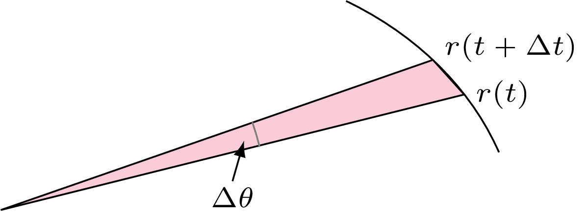Na początek wykorzystajmy II prawo (o którym można więcej przeczytać w artykule Grzegorza Łukaszewicza i Mikołaja Sierżęgi, \(\Delta^{10}_{20}\)). Rozpatrzmy moment, gdy planeta w chwili \(t\) jest w odległości \(r\) od środka układu współrzędnych. Po bardzo krótkim czasie \(\Delta t\) jej odległość od Słońca praktycznie się nie zmieni: \(r(t)\approx r(t+\Delta t)\) (rys. 8), a jej współrzędna kątowa zmieni się o malutkie \(\Delta \theta\). Pole wymiecione w czasie \(\Delta t\) jest więc w przybliżeniu równe polu trójkąta: \[\frac12 r^2 \sin (\Delta \theta) \approx \frac12 r^2\Delta \theta,\] więc po podzieleniu przez \(\Delta t\) i odpowiednim przejściu do granicy otrzymujemy \(\frac 12 r^2 \frac{d\theta}{dt}\) jako prędkość ,,wymiatania pola”. Wynika stąd, że jeśli zdefiniujemy teraz moment pędu: \[L=mr^2\frac{d\theta}{dt},\] to pozostanie on niezmienny w czasie ruchu planety. To dla nas dobra wiadomość, bo pozwala pozbyć się ze wzoru na energię kinetyczną pochodnej kąta \(\theta\). Wystarczy tylko podstawić \(\frac{d\theta}{dt} = \frac{L}{mr^2}\).