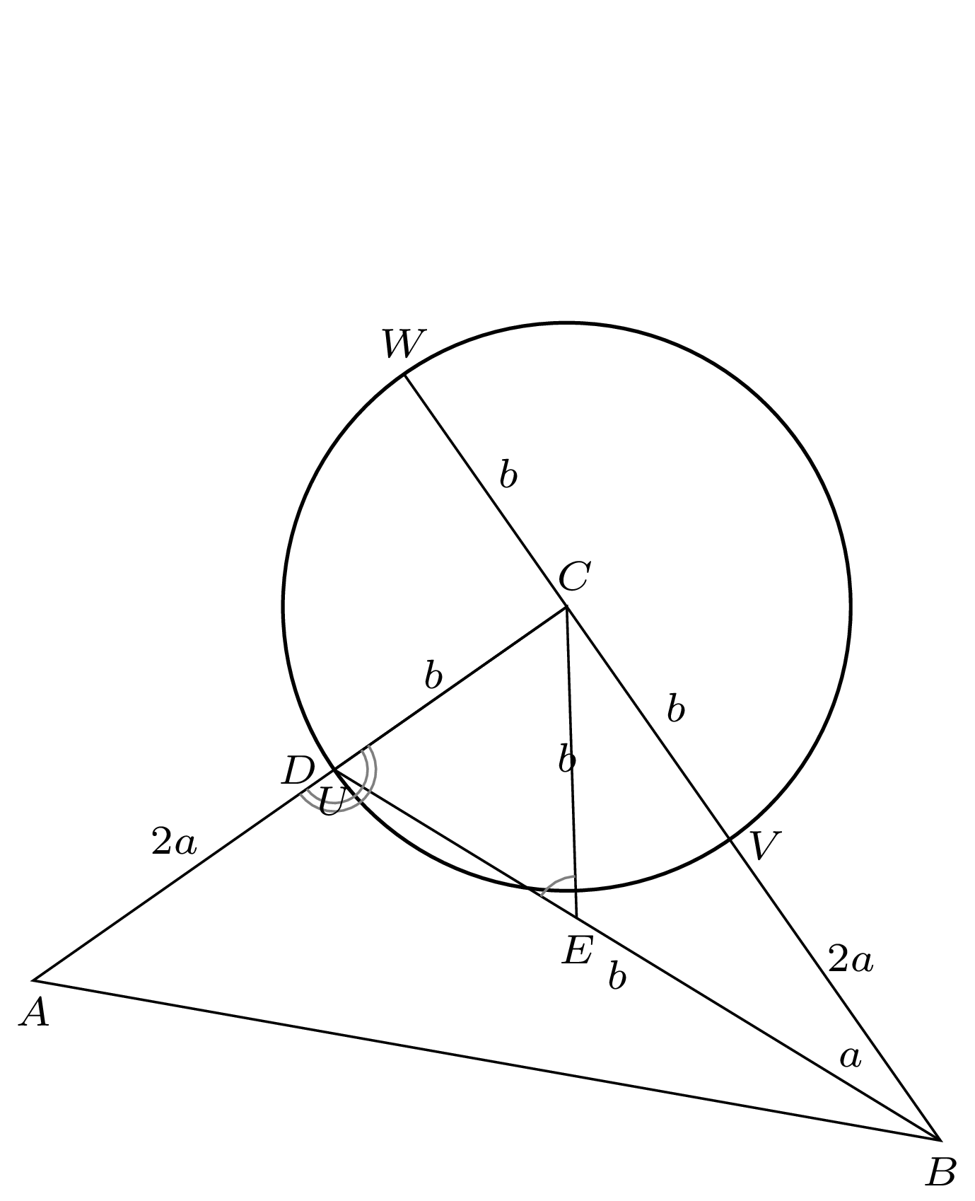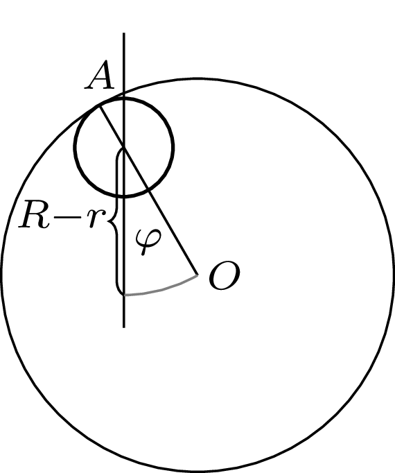 Oznaczając \({\varphi=\measuredangle{PAO}=\measuredangle{PUX}},\) mamy \({R\,{\rm{tg}\,}\varphi=OA\,{\rm{tg}\,}\varphi=OP={3\over 4}{R}},\) więc \({{\rm{tg}\,}\varphi={3\over 4}},\) wobec czego \({\cos\varphi={4\over 5}},\) \({\sin\varphi={3\over 5}}.\) Dalej, \({3r=UX=UP\cos\varphi=({3\over 4}{R}{-}3r){\cdot}{4\over 5}},\) skąd \({R=9r}.\) I ostatecznie: \({d=AC=AB\cos\varphi=2R\cdot{4\over 5}=18r\cdot{4\over 5}}.\)