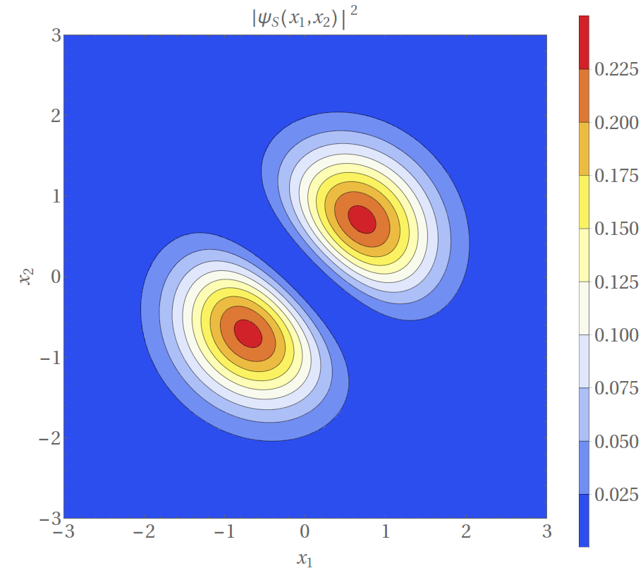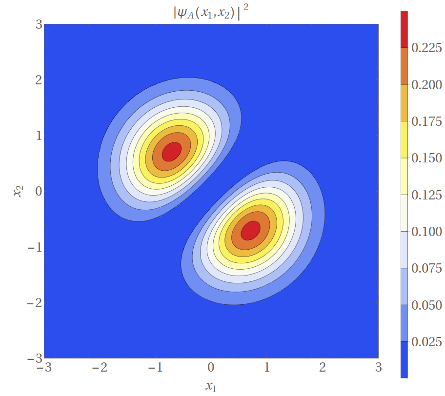 Dolny rysunek: przypadek antysymetryczny – prawdopodobieństwo jest maksymalne dla przeciwnych położeń cząstek \(x_1=-x_2=\pm 1/\sqrt{2}\)