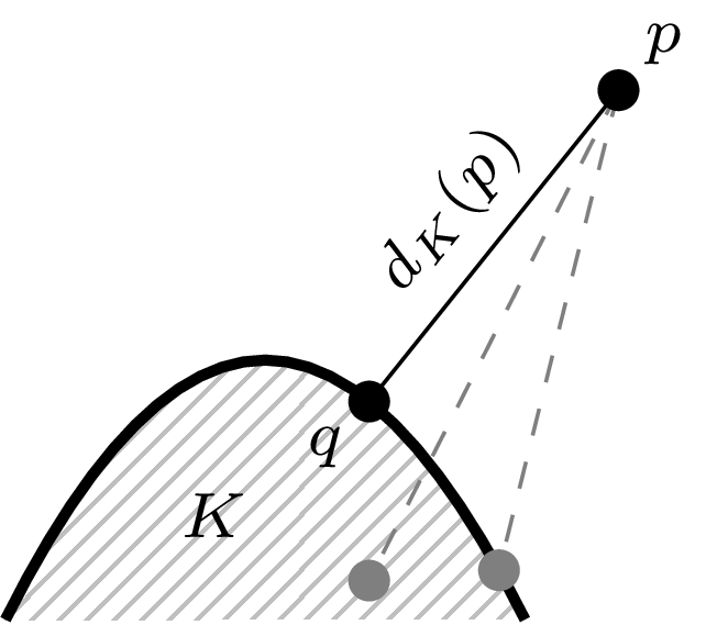Wytrawny Czytelnik spostrzeże w definicji funkcji \(d_K\) pewną subtelność: czemu niby wartość minimum musiałaby istnieć, skoro bierzemy ją po zbiorze, który wcale skończony być nie musi? Otóż właśnie tu interweniuje (po raz pierwszy) domkniętość – jeżeli weźmiemy ciąg punktów \(q_j\) z \(K,\) które prawie realizują minimum i są coraz bliżej tego celu, to okaże się, że pewien podciąg punktów \(q_j\) będzie zbieżny do jakiegoś punktu \(\hat{q}\in K.\) Okazuje się, że \(\hat{q}\) będzie realizować minimum! Szczegóły tego rozumowania pozostawiamy Ambitnym Czytelnikom jako ciekawe ćwiczenie.