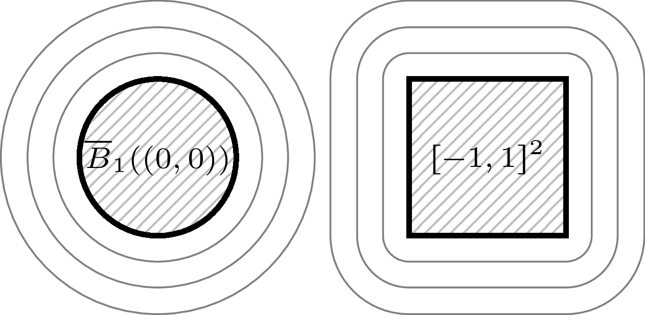 Rys. 2. Poziomice funkcji \(d_K\) w przypadku, gdy \(K\) jest kołem jednostkowym \(\overline{B}_1((0,0))\) i kwadratem \([-1,1]^2\)