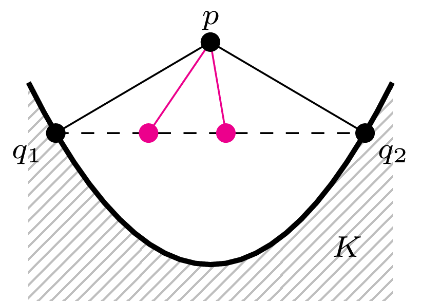 Rys. 3. Jeśli punkty \(q_1,q_2\) są w tej samej odległości od \(p,\) to każdy inny punkt odcinka \([q_1,q_2]\) jest bliżej. Gdy \(K\) jest wypukły, to zgodnie z definicją zawiera cały ten odcinek