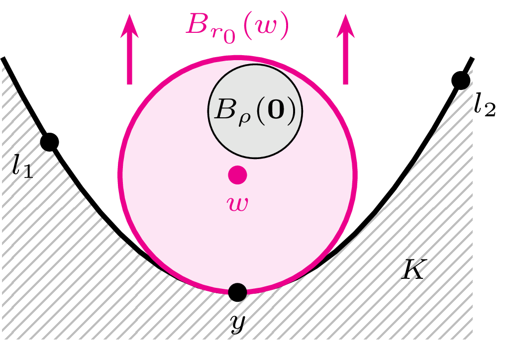 Znów pojawia się odwieczne pytanie: dlaczego przesunięcie \(\overline{B}_{r_0}(w)\) jest rozłączne z \(K\)? Istotna tu jest samotność \(y\) oraz (który to już raz!) domkniętość \(K.\)