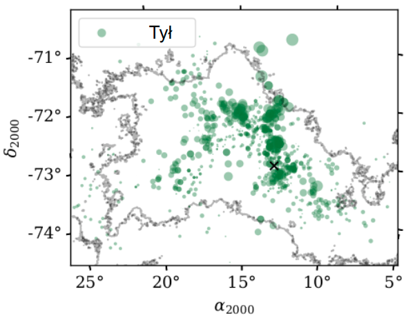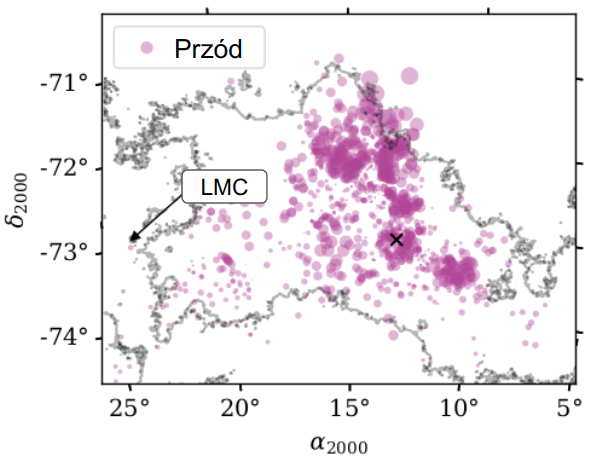 Obszar Małego Obłoku Magellana. Gwiazdy w strukturze ,,z przodu” i gwiazdy w strukturze ,,z tyłu”, uzyskane z ekstynkcji i prędkości radialnych tych gwiazd. Strzałka wskazuje kierunek do Wielkiego Obłoku Magellana (LMC). Rysunek 9 w artykule Murray et al., arXiv:2312.07750