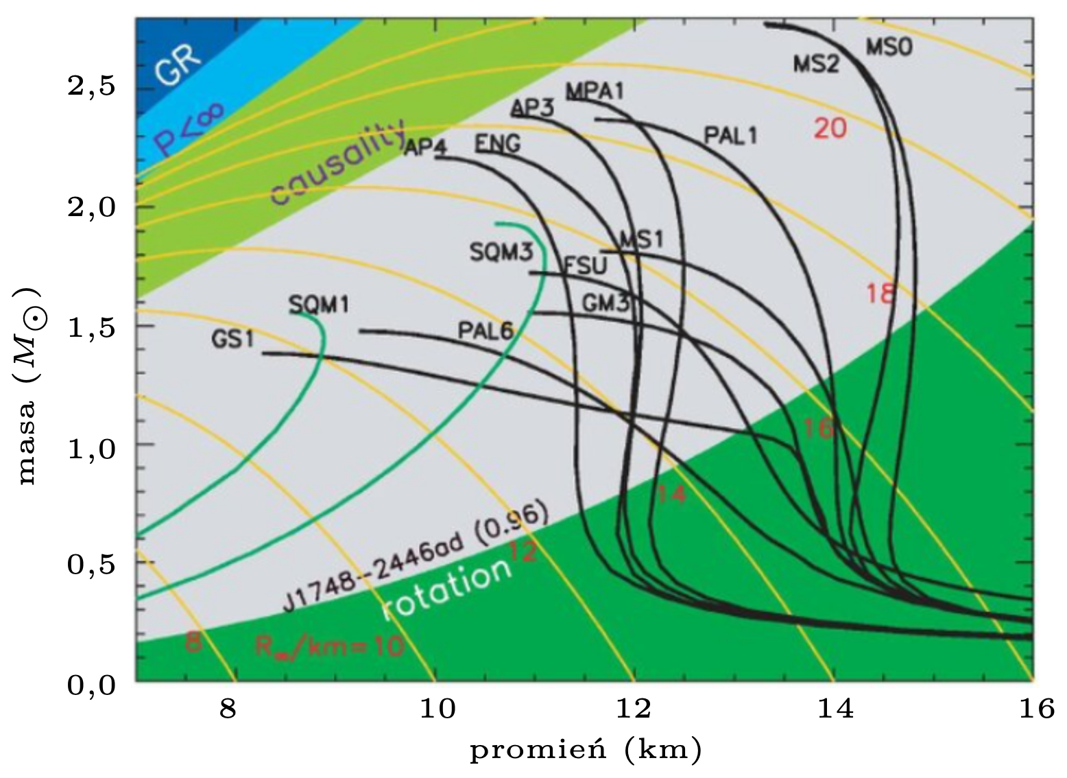 Rys. 2. Wykres pokazujący relację promień-masa dla równań stanu gwiazd neutronowych. Pochodzi z publikacji Paerels, F., Mendez, M., Agueros, M. i inni, 2009, ,,The Behavior of Matter under Extreme Conditions”, White paper submitted to the Astro2010 Decadal survey of Astronomy and Astrophysics
