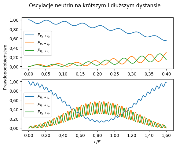 Na koniec zaś dokonujemy pomiaru neutrin, które dolecą do Ziemi. Ponieważ każdy ze stanów masowych porusza się jako fala o innej długości, więc fale, które w chwili emisji były w tej samej fazie, docierają do Ziemi przesunięte względem siebie. W konsekwencji ich złożenie reprezentuje inny stan niż stan początkowy wyemitowany na Słońcu. To powoduje – nawet jeśli stan początkowy był stanem o ustalonym zapachu – że stan końcowy może być już złożeniem stanów o różnych zapachach. Po dokonaniu kilku przekształceń algebraicznych odzwierciedlających te zmiany otrzymujemy prawdopodobieństwo zmiany zapachu \(e\) w zapach \(\mu\) (dla przypadku dwóch neutrin): \[P_{e \rightarrow \mu} = \sin^2 2\theta \sin^2\left(\frac{(m_2^2 - m_1^2)L}{4E}\right),\] gdzie \(L\) to przebyta odległość od źródła, \(E\) to energia wyemitowanego neutrina, natomiast \(m_1\) i \(m_2\) to dobrze określone masy neutrin \(1, 2.\) Oczywiście mamy też: \[P_{e \rightarrow e} = 1 - \sin^2 2\theta \sin^2\left(\frac{(m_2^2 - m_1^2)L}{4E}\right).\] Jak w praktyce (w przypadku trzech neutrin) działają oscylacje neutrin, można zobaczyć na wykresie.