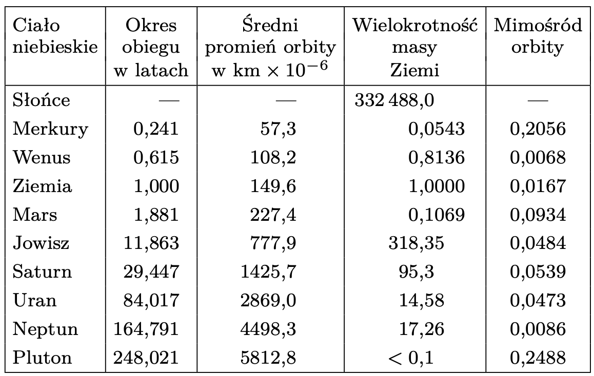 Sprawdźmy teorię Newtona. W tym celu należy popatrzeć w niebo i mierzyć. Napięcie rośnie, gdyż jej niezgodność z trzecim prawem Keplera, które dość dokładnie zgadza się z obserwacjami astronomicznymi, zaprzeczałaby jej uniwersalności. Mamy następujące dane astronomiczne (za średni promień orbity przyjmujemy tu \(r_{\mathrm{mean}} = \sqrt{ab}\)):