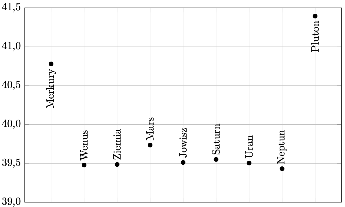 Stąd otrzymujemy interesujący nas diagram pokazujący wartości \(\frac{GM_s T_o^2}{r_\mathrm{mean}^3}\) dla kolejnych ciał Układu Słonecznego.