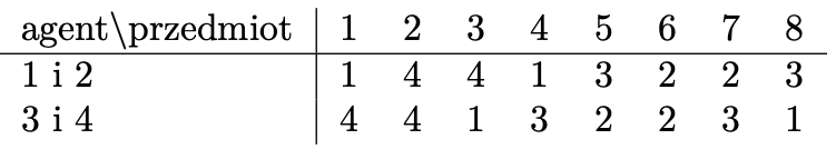 Zauważmy, że w podziale \(\mathcal{P}_1\) każdy agent dostaje jedną czwartą łącznej wartości wszystkich przedmiotów według funkcji użyteczności \(u_1=u_2,\) a w podziale \(\mathcal{P}_2\) każdy agent dostaje jedną czwartą łącznej wartości wszystkich przedmiotów według funkcji użyteczności \(u_3=u_4.\) Zatem podział \(\mathcal{P}_1\) jest mms-podziałem dla agentów 1 i 2, a podział \(\mathcal{P}_2\) jest mms-podziałem dla agentów 3 i 4. Dla każdego \(i\) wartość \(\mathsf{mms}_i\) wynosi więc 5.