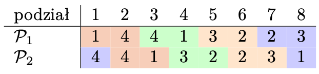 Rozważmy dwa podziały zbioru przedmiotów na cztery spójne bloki, przedstawione poniżej: